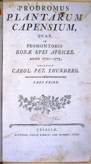 Perhaps Linnaeus’ most famous pupil, Thunberg took his Uppsala degree in medicine. Linnaeus introduced Thunberg to friends in Paris, through whom Thunberg was invited to accompany a Dutch expedition to Japan in 1772. On the way to Japan he stopped in South Africa to learn to speak Dutch; the plants he studied there preoccupied him for the rest of his life and are the basis of his work in Prodromus Plantarum. Upon his return to Sweden in 1779, Thunberg was appointed botanical demonstrator at the University of Uppsala.