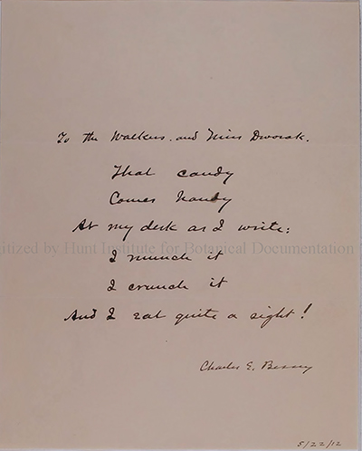 This collection is an arrangement of letters, postcards and other materials relating to botanists and naturalists throughout the 20th century. The material was received by the Hunt Institute for Botanical Documentation on 18 January 1968 from Professor William Winfield Ray (1909–1995). According to our correspondence from the time, the materials were sent to us as part of a larger collection amalgamated from various sources by Professor Ray, including materials given to him by Thomas J. Fitzpatrick (1868–1952) and Charles E. Bessey (1845–1915). The materials presented here were isolated from their original collection around July 1968 and put into their current organization by our founding director, George H. M. Lawrence (1910–1978; director, 1960–1970). It is expected that these items may be used both for their historical interest and as a sampling of handwriting for the botanists represented within.