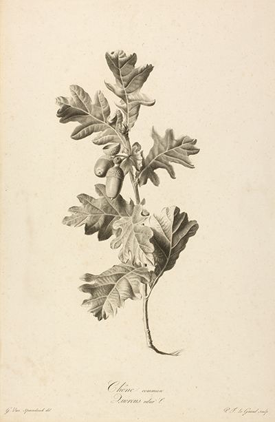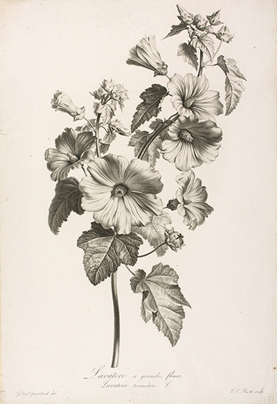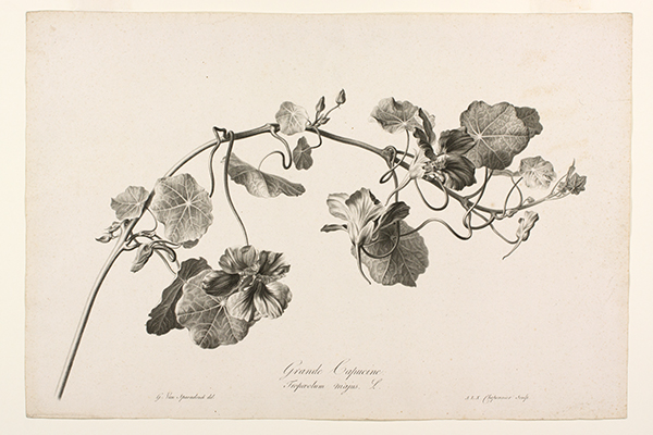 Gérard van Spaendonck's ability to capture the naturalism of living plants in his drawings and paintings is as inspirational today as it was over 200 years ago. Twenty-four of van Spaendonck's dynamic charcoal drawings were reproduced as stipple engravings for his Fleurs Dessinées d'après Nature (Paris, l'Auteur, au Jardin des Plantes, 1801). It was issued in six parts of four prints and sold as colored or uncolored versions. Pierre François Le Grand (1743–1824) made most of the engravings, with others by Carrée (fl.1801), Alexandre L. X. Chaponnier (1753–ca.1806), Jean Godefroy (1771–1839) and Louis Charles Ruotte (1754–1806). These prints remain some of the best examples ever produced using this printmaking process. Van Spaendonck considered these prints a valuable teaching aid for his students. They portrayed not only the incredible life force of each documented plant but also revealed that stipple engraving could effectively capture the subtle variations of tonality in a drawing or painting. The Hunt Institute Art collection includes 16 of the 24 plates from this publication, 14 printed solely in black ink and two printed in color.