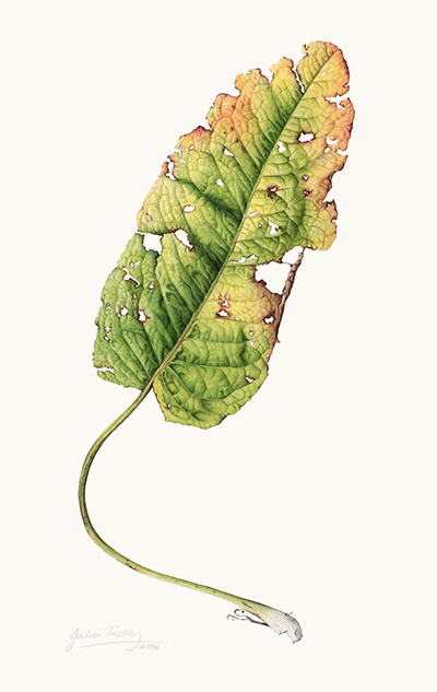 Rumex obtusifolius leaf [Rumex obtusifolius Linnaeus, Polygonaceae], watercolor on paper by Julia Trickey (1964–), 2006, 55 × 36.5 cm, HI Art accession no. 7755, reproduced by permission of the artist.