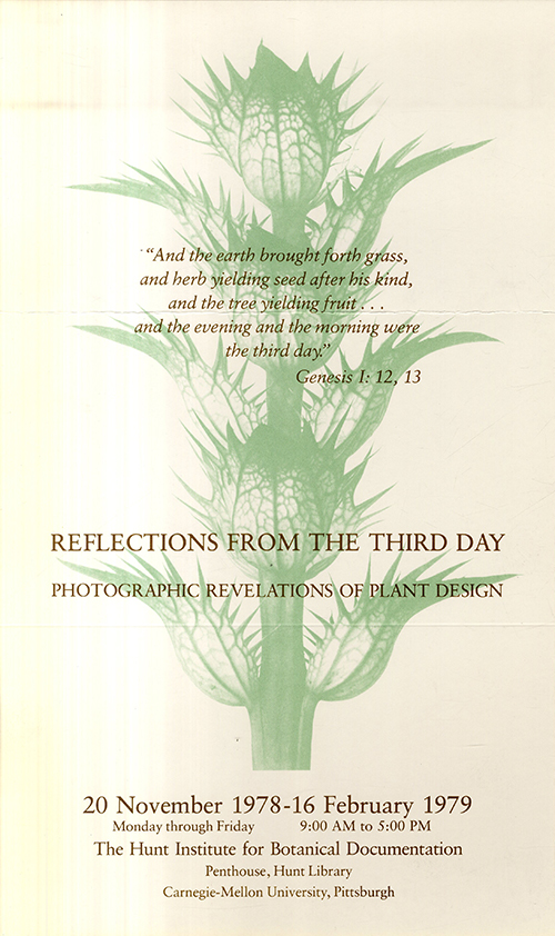 One of the Institute's major shows of the year, this exhibition was conceived to show the range and variety of photographic treatment of the forms, structures, patterns and textures to be found in the plant world. This exhibition featured some 65 works by 25 well-known photographers. Most of the works were on loan from galleries, the Library of Congress and the individual photographers. The photographers included Ansel Adams, R. F. Ahern, David Aschkenas, Oscar Bailey, Karl Blossfeldt, Dennis Brokaw, Harry Callahan, Harold Corsini, Imogen Cunningham, Jean Dieuzaide, Irene Fay, Andreas Feininger, Lee Friedlander, Alexandre Georges, Clyde Hare, Joan W. Nowicke, Paul Outerbridge, Albert G. Richards, Joseph A. Rosen, Harold Frank Sherwood, Edward Jean Steichen, Paul Strand, Jerry Uelsmann, Brett Weston and Edward Weston. A catalogue accompanied the exhibition.