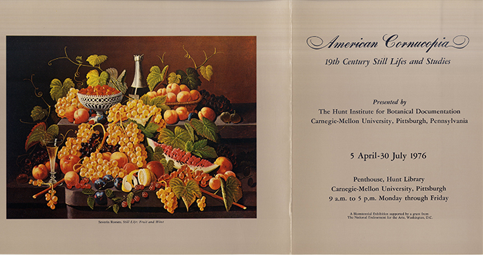 Conceived as the Institute's major Bicentennial year exhibition, this show comprised a representative survey of flower and fruit still lifes by American artists. The works, primarily oil paintings, were assembled from private collections and museums from all over the country, including the National Portrait Gallery, the Museum of Fine Arts in Boston, the New York Historical Society and the Hirschl and Adler Galleries in New York. Dr. William Gerdts, professor of art at Brooklyn College and recognized authority on American still life painting, guided the selection of art for the exhibition. On display were 59 major paintings, supplemented by some two dozen other items including drawings, watercolors, hand-colored and chromolithographs and book illustrations. Artists represented included the Peales of Philadelphia, William Michael Harnett, Samuel Marsden Brookes, Martin Johnson Heade, Severin Roesen, Ralph Blakelock and Childe Hassam. The exhibition was supported in part by a grant from the National Endowment for the Arts. A catalogue and poster accompanied the exhibition.
