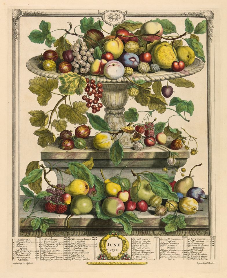 As the newly planted garden soaks up the early morning rain in Pittsburgh, we survey the space to see if there is room for a few things inspired by The Twelve Months of Fruits (1732). June offers varieties of apricots, apples, cherries, currants, gooseberries, mulberries, peaches, plums, pears and raspberries. Now we're dreaming of fruit salads and preserves. There should be just enough space for something delicious.