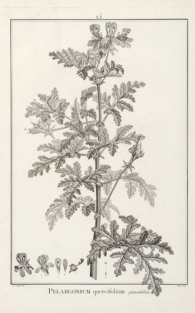 Figure 8. Pelargonium quercifolium pinnatifidum [Pelargonium quercifolium (Linnaeus f.) L'Héritier, Geraniaceae], engraving by Milsan, 53.5 × 36 cm, after an original by James Sowerby (1757–1822) for Charles Louis L'Héritier de Brutelle (1746–1800), Geraniologia (Paris, Peter-Francis Didot, prostrat ... Ludovicum Nicolaum Prévost [etc.], 1787–1788[–1792], pl. 15), HI Art accession no. 2218.